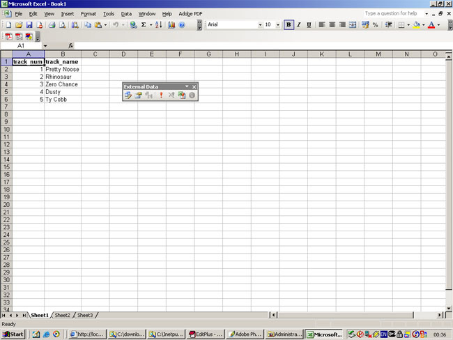 As we have our system-wide DSN set up and connecting to the MySQL server, it is time to test it in a real application. Here I will be using Excel and Access to read from the test database that ships with MySQL. I have created a test table in that database called track_listing, which has two columns and five records. It is this data that we will be importing into these MS Office applications.