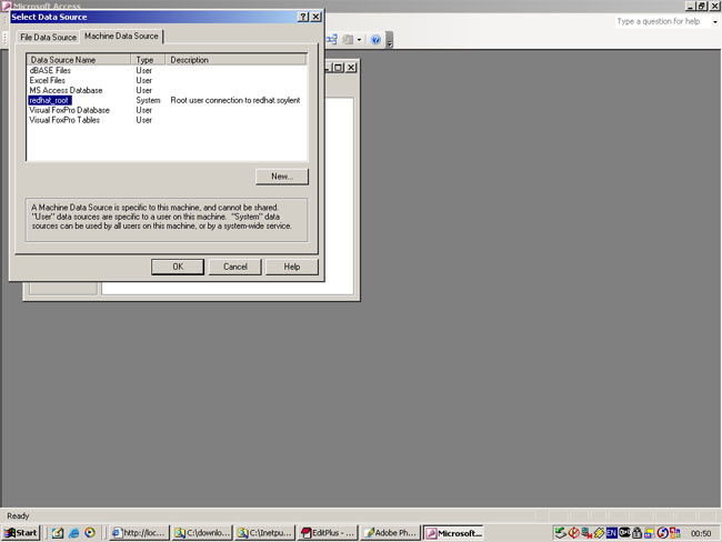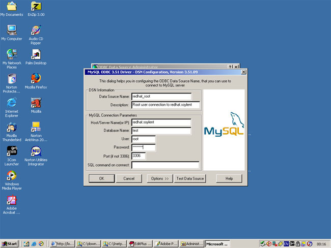 Granting table privileges from the MySQL console is beyond the scope of this tutorial, so I will assume that a DBA has set up this account correctly. In my test environment, the MySQL database and ODBC client are on separate machines that are networked together: redhat.soylent contains the MySQL database running on Linux; while w2k2.soylent is acting as the Windows 2000 client with the MySQL Connector/ODBC driver installed. For simplicity I will use the root account and a sample password (but you should never do this in a live environment for security reasons, as the root user can see everything on the database!).