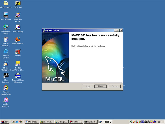 We will begin by installing the MySQL Connector ODBC package on w2k2.soylent. After downloading the Windows executable file, double click on it and follow the onscreen instructions. It is quite safe to choose all of the default options for this simple install. If you install it successfully, you should see a confirmation screen similar to the one below: