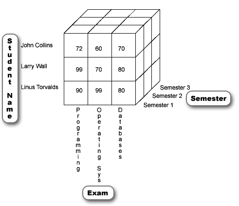 Notice how all related information neatly lines up in the multi-dimensional view, for example all programming results for John Collins over all three semesters lines up along the z-axis (i.e. from the diagram view perspective, the Semester dimension), while all exam results for John Collins in all subjects line up on the x-axis (the Exam dimension). Programming results for all students line up on the y-axis (the Student Name dimension).