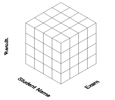 As you can see from Figure 3, there is no need to have Result as a dimension, because the exam results are going to be contained within the cells of the database structure. Another obvious advantage is the removal of the duplication in the relational table, where each student name was repeated three times for each exam that they participated in. In the multi-dimensional view, the Student Name and the Exam become dimensions, or in effect indexes into that data, so having duplicates does not make any sense.