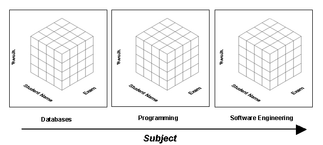 In a multi-dimension database system, the data is presented to the user in such a way as to represent a hypercube, or multi-dimensional array, where each individual data value is contained within a cell accessible by multiple indexes. A simple example is given in the previous diagram, Figure 1, where a fictional student exam result database is presented. This database contains three dimensions, namely Result, Student Name and Exam. In this example, an individual student (represented by Student Name) may have their exam results for several exams compared over a period of time, for example a four-year undergraduate course. This ability to present data in such a top level view is unique to multi-dimensional systems, and shows just how powerful these systems can be. Of course a multi-dimensional system is not limited to three dimensions as in the previous example, but when we go beyond that amount, it becomes more difficult to present such structures in a pictorial view. If we stick with the previous example presented in Figure 1; let us now add a fourth dimension called Subject. Let us assume our students study computer science, with subjects in Databases, Programming and Software Engineering. If we imagine this new dimension as being a box containing our previous three dimensions, then we would have three such boxes, namely one for each subject that our students were tested on, as shown in Figure 2.