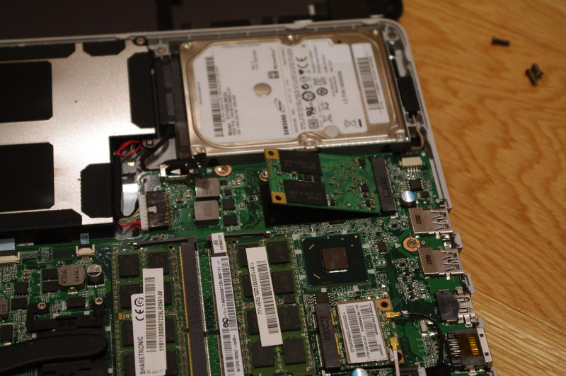 Once you open up the laptop (just three screws on the underside, under the rubber feet), you can see the existing 32GB MSATA SSD beside the main HD. It is circled in red above.