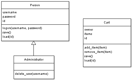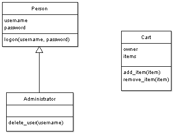 Here we have defined a Cart with an owner (which will be a username from the Person class), an array of items to hold the actual shopping cart contents, and some new functions for adding and removing items from the cart.