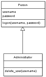 What this means is that the administrator class will inherit the username and password attributes from the parent class, as well as the logon function. The beauty of inheritance is that it is one way: the person class will not have access to the specialized delete_user function, which is great because we only want administrators to have that functionality. Here is the new class in code, notice the use of the extends keyword: