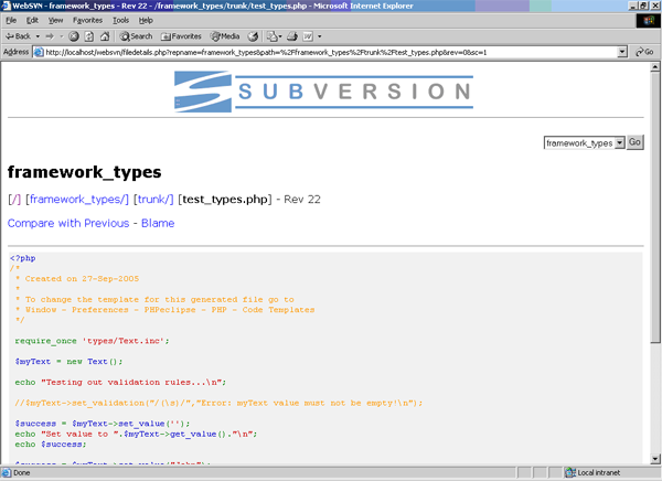 WebSVN[9] is a web client for viewing the contents of Subversion repositories through a web browser, which is written in PHP and therefore can be hosted under any server that supports that language, such as IIS or Apache HTTP. While essentially only offering read access, this tool is nonetheless useful for presenting code online to a partner or to the public for an open source project.