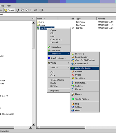 TortoiseSVN[8] is a Windows Explorer extension for Windows users that allows you to create and access Subversion repositories via a right-click context menu in Explorer, allowing for quick access to all Subversion commands for working with files.